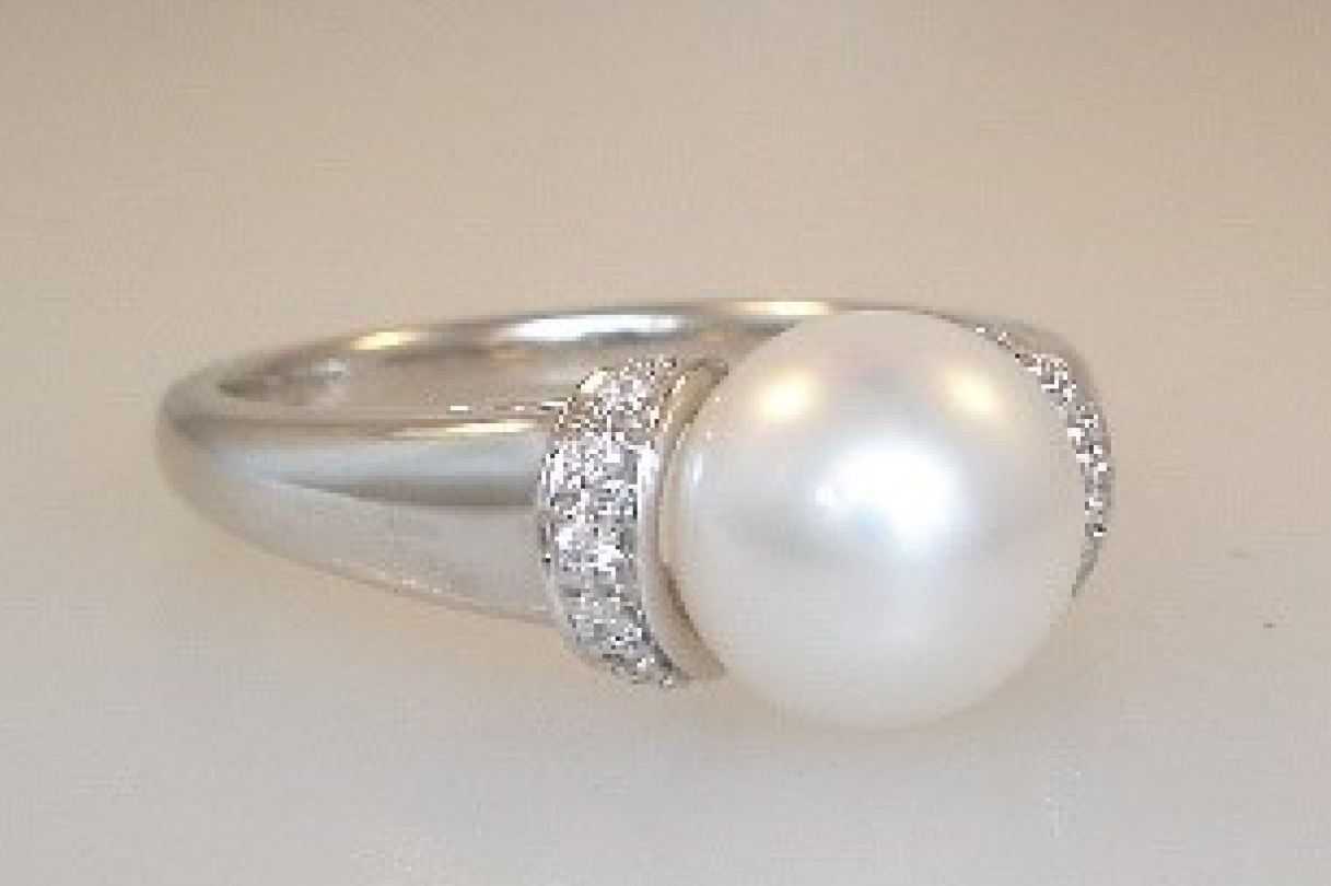 Ladies 14k white gold fashion ring, set with one 8mm. round white freshwater pearl and (14) fourteen round brilliant cut diamonds weighing a total of .09ct..