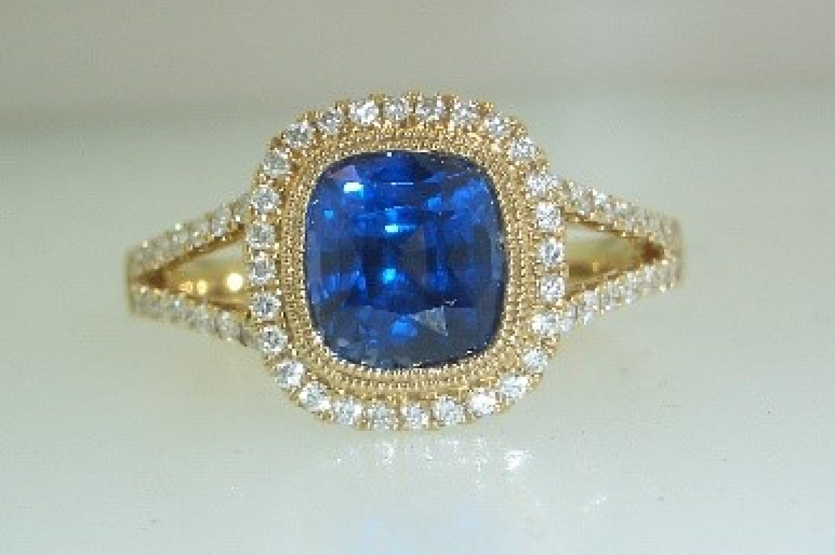 Ladies 14k yellow gold fashion ring, set with (1) one cushion shape (7.25x6.8mm) blue sapphire of gem quality and (56) fifty-six round brilliant cut diamonds weighing a total of .28ct..