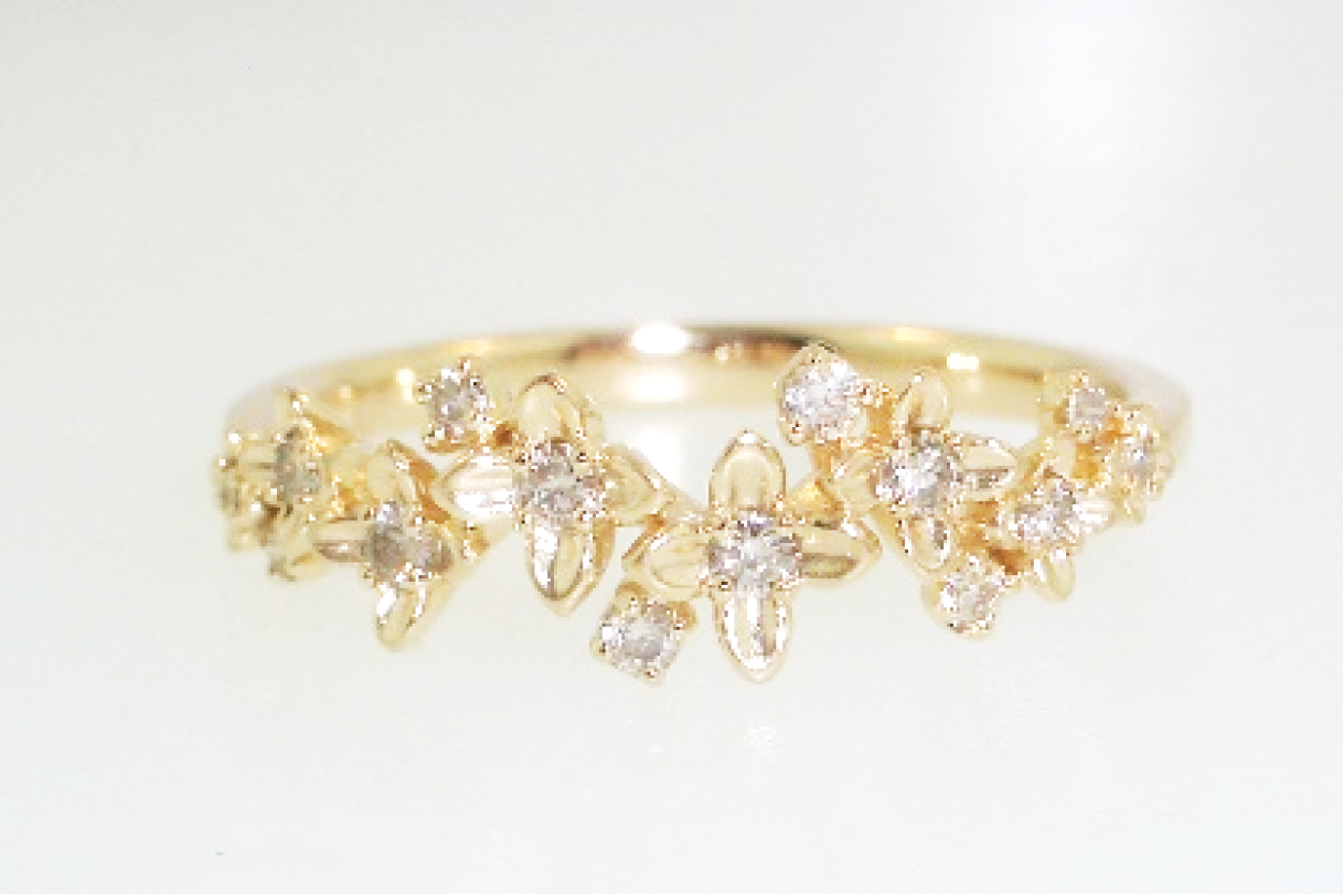 Ladies 14k yellow gold band with 3D floral details set with (14) fourteen round brilliant cut diamonds that weigh a total of .16 carats.