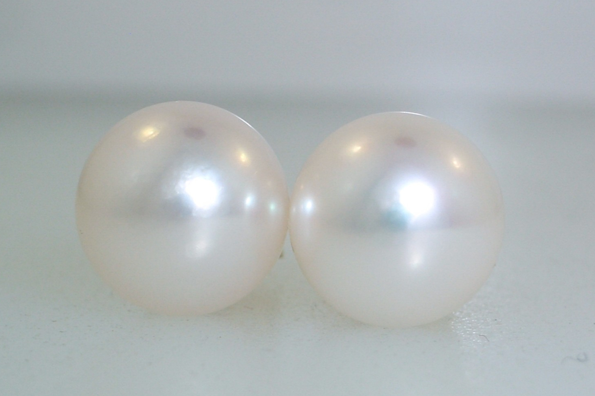 Ladies 14k yellow gold 8mm Imperial “AA” quality Akoya pearl stud earrings with a white body color and moderate rose overtones. Gold weight with pearls is 2.06 grams.