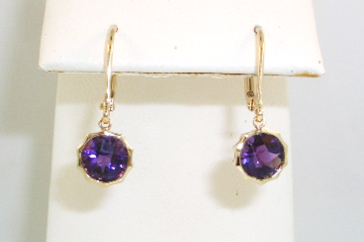 Ladies 14k yellow gold drop style leverback earrings set with (2) two 5mm round amethysts weighing a total of .86ct..