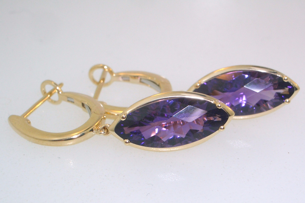 Ladies 14k yellow gold dangle style earrings set with (2) two 14 x 6mm concave marquise cut amethyst gemstones with checkerboard faceting that weigh a total of 3.64 carats. Gold weight with gemstones is 5 grams.