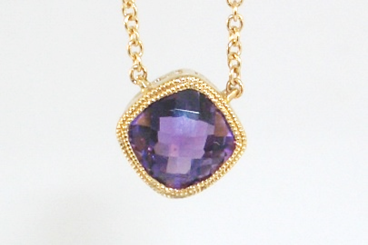 Ladies 14k yellow gold and amethyst necklace set with (1) one 6mm antique cushion shaped amethyst with checkerboard faceting and double milgrain detailing. Finished with a 14k yellow gold cable chain measuring 18 inches