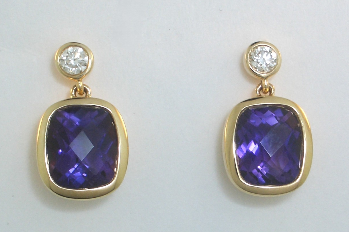 Ladies 14k yellow gold earrings bezel set with (2) two antique cushion cut amethyst that weigh a total of 2.20 carats and (2) two round brilliant cut diamonds that weigh a total of .13 carats.
