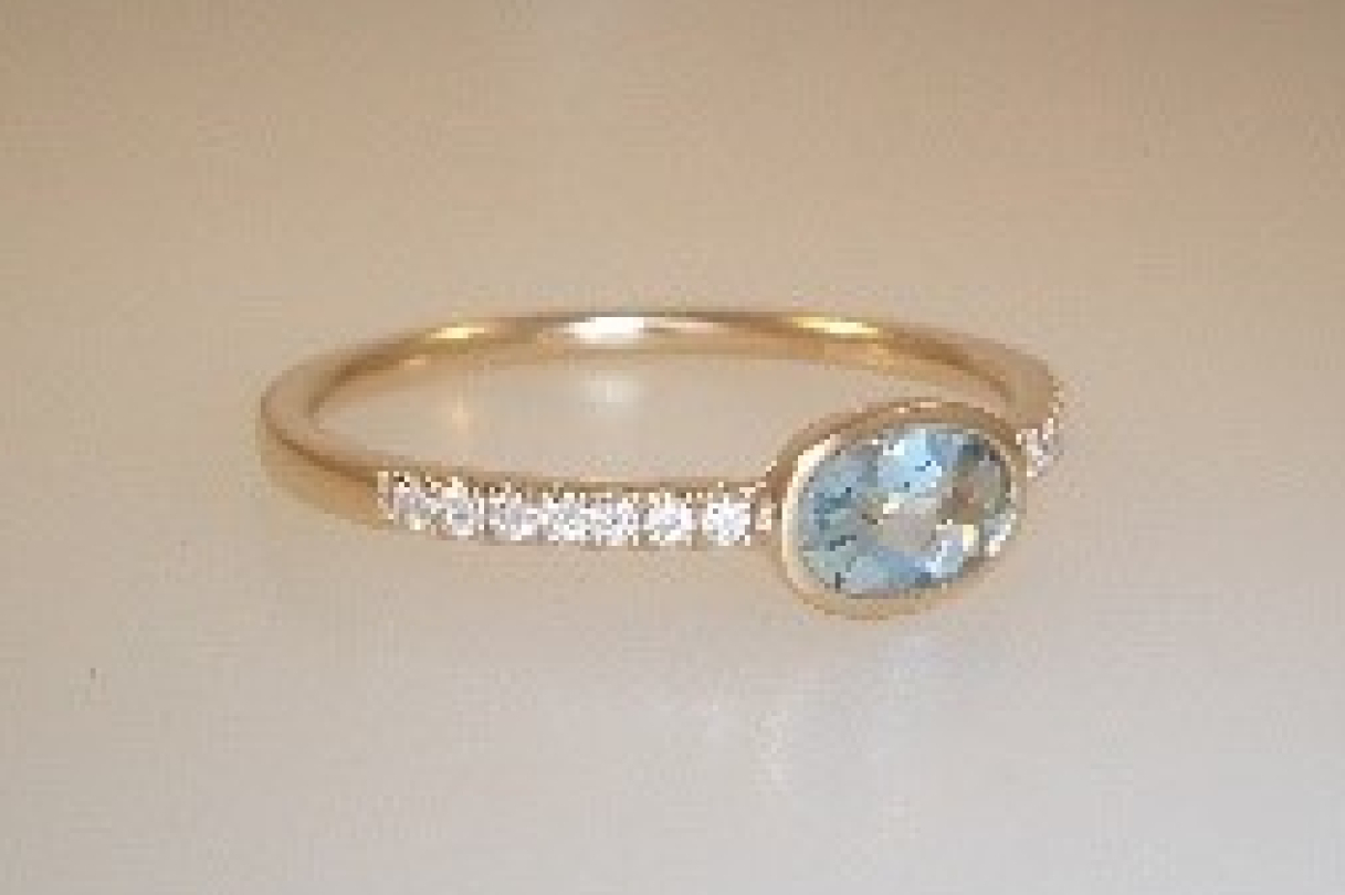 Ladies 14k yellow gold fashion ring bezel set with one 6mm x 4mm oval faceted aquamarine weighing .54 carat and (14) fourteen round brilliant cut diamonds weighing a total of .11ct..