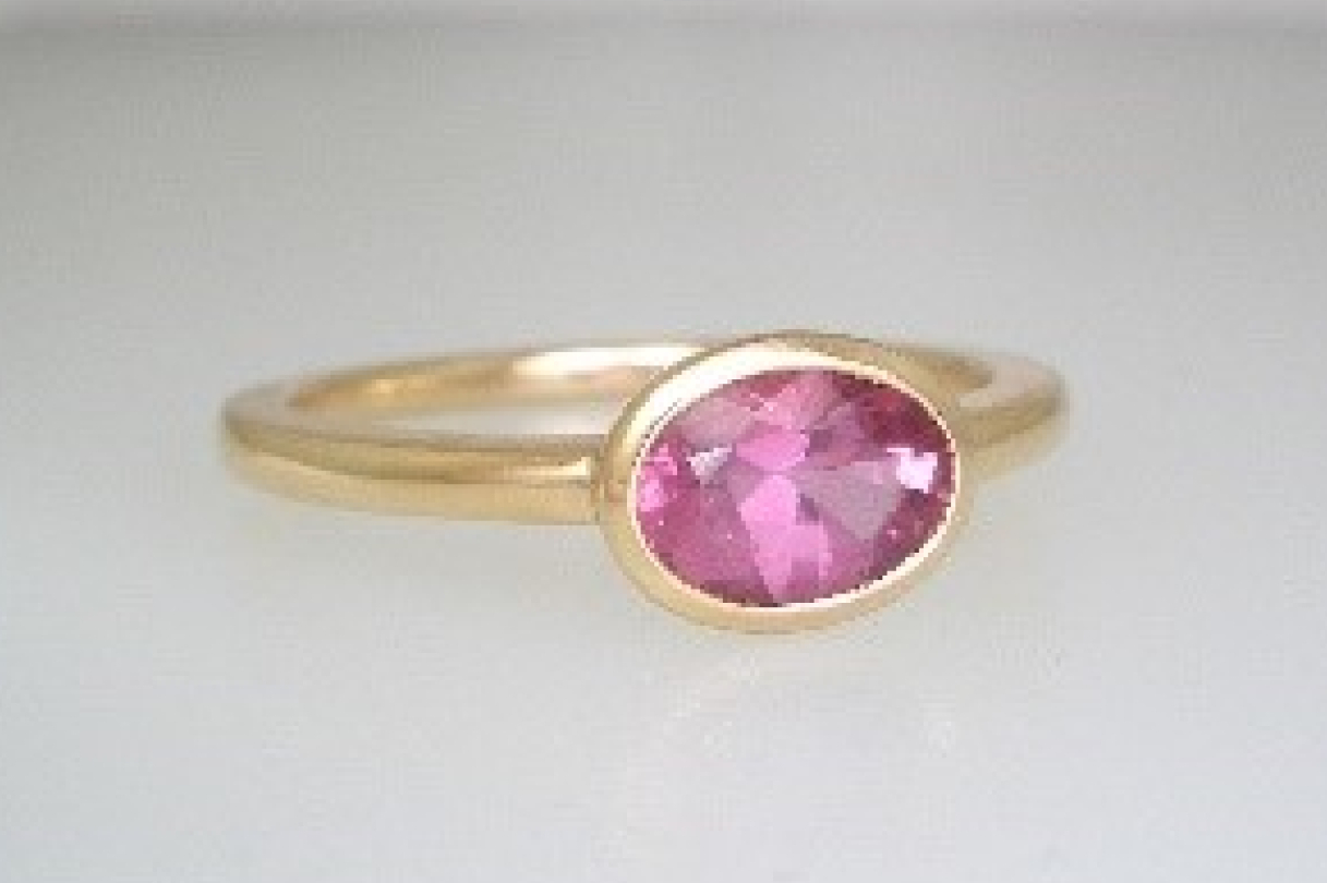 Ladies 14k yellow gold fashion ring, bezel set east west with one 7mm. x 5mm. oval faceted pink tourmaline gemstone weighing .77 carats.