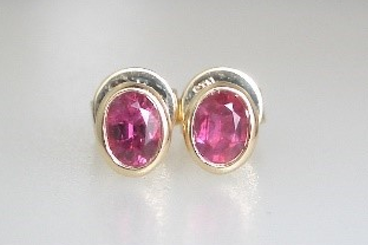 One pair of ladies 14k yellow gold bezel set ruby stud earrings, set with (2) two 3 mm. x 4 mm. oval shaped ruby gemstones that weigh a combined total of .48ct..