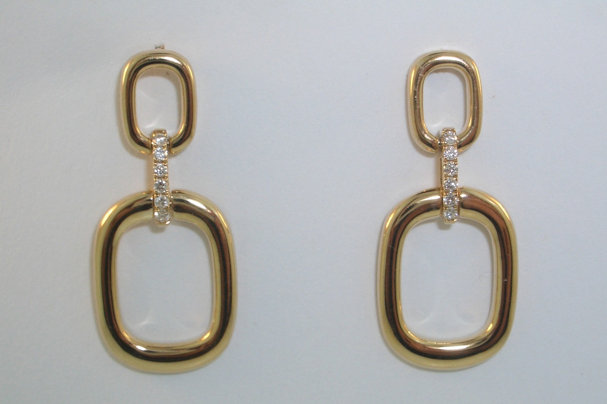 Ladies 14k yellow gold dangle style earrings set with (12) twelve round brilliant cut diamonds that weigh a total of .10 carats. Gold weight with diamonds is 3.39 grams.