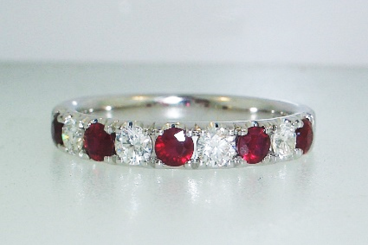Ladies 14k white gold ring set with (5) five round cut rubies that weigh a total of .55 carats alternating between (4) four round brilliant cut diamonds that weigh a total of .38 carats.