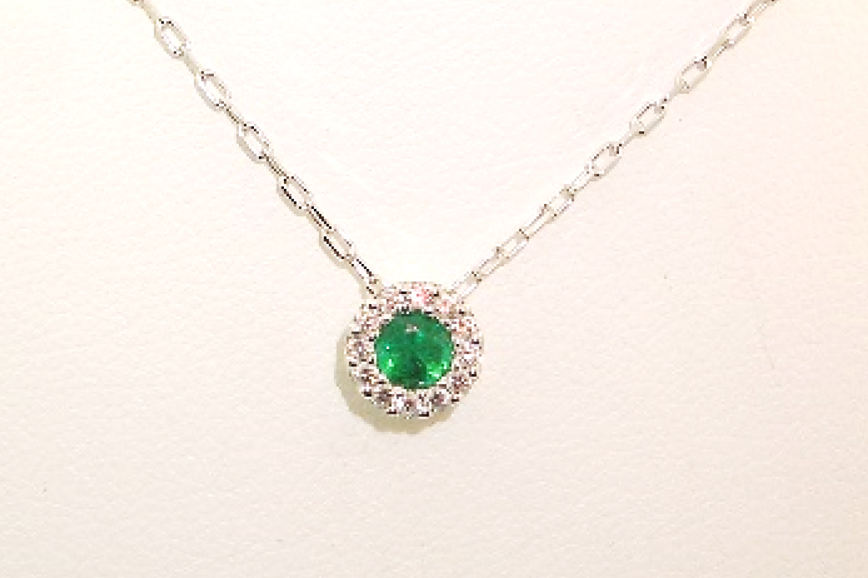Ladies 14k white gold emerald pendant, set with (1) one round faceted 4mm emerald gemstone that weighs .15ct., and (12) twelve round brilliant cut diamonds that weigh a total of .10ct. Complete with a 14k white gold paperclip chain, measuring 18 inches in length.