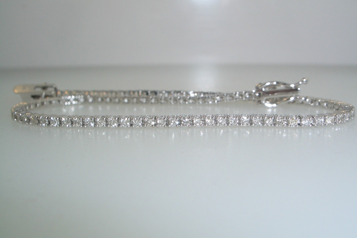 Ladies 14k white gold tennis bracelet set with (102) one hundred and two round brilliant cut diamonds that weigh a total of 1.12 carats. Gold weight with diamonds is 4.86 grams.