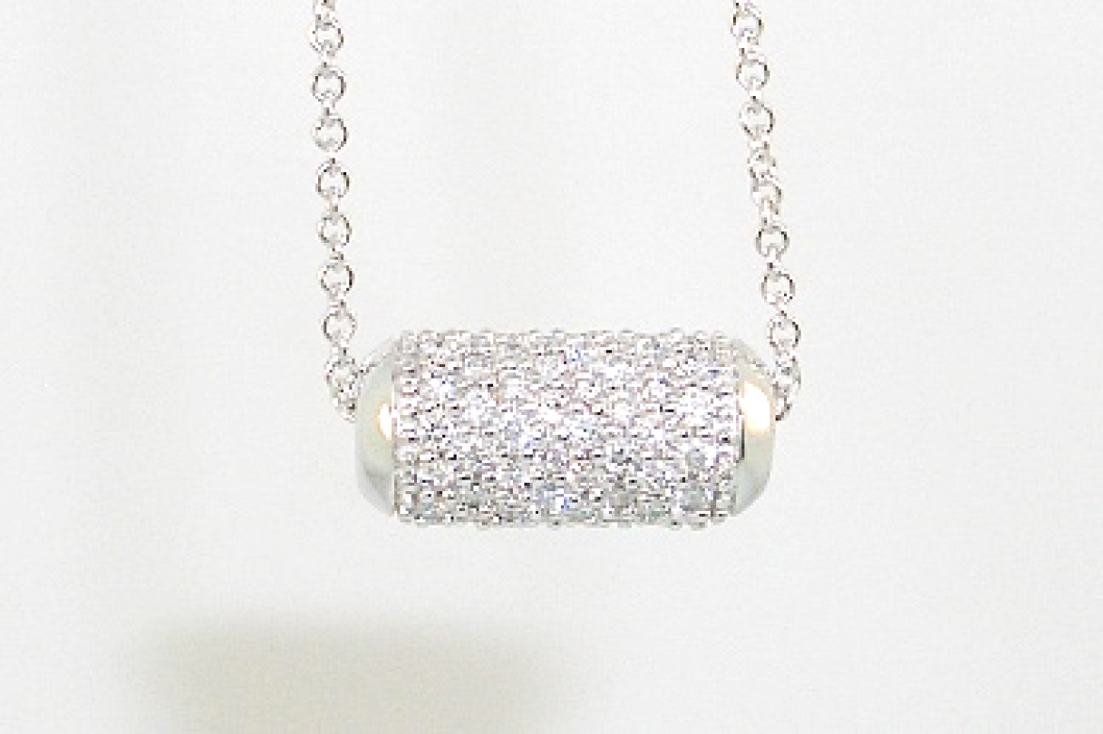 Ladies 14k white gold barrel pendant set with (96) ninety-six round brilliant cut diamonds that weigh a total of .53 carats. Complete with a 20-inch adjustable white gold cable chain.