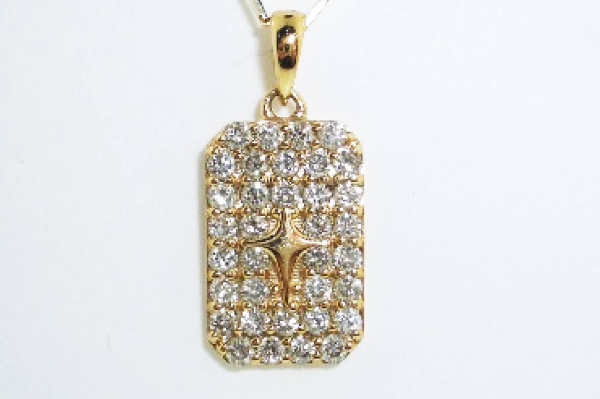 Ladies 14k yellow gold dog tag pendant with a polished star emblem in the center set with (35) thirty-five round brilliant cut diamonds that weigh a total of .47 carats. Complete with a 14k yellow gold lumicina chain that measures 18inches in length.