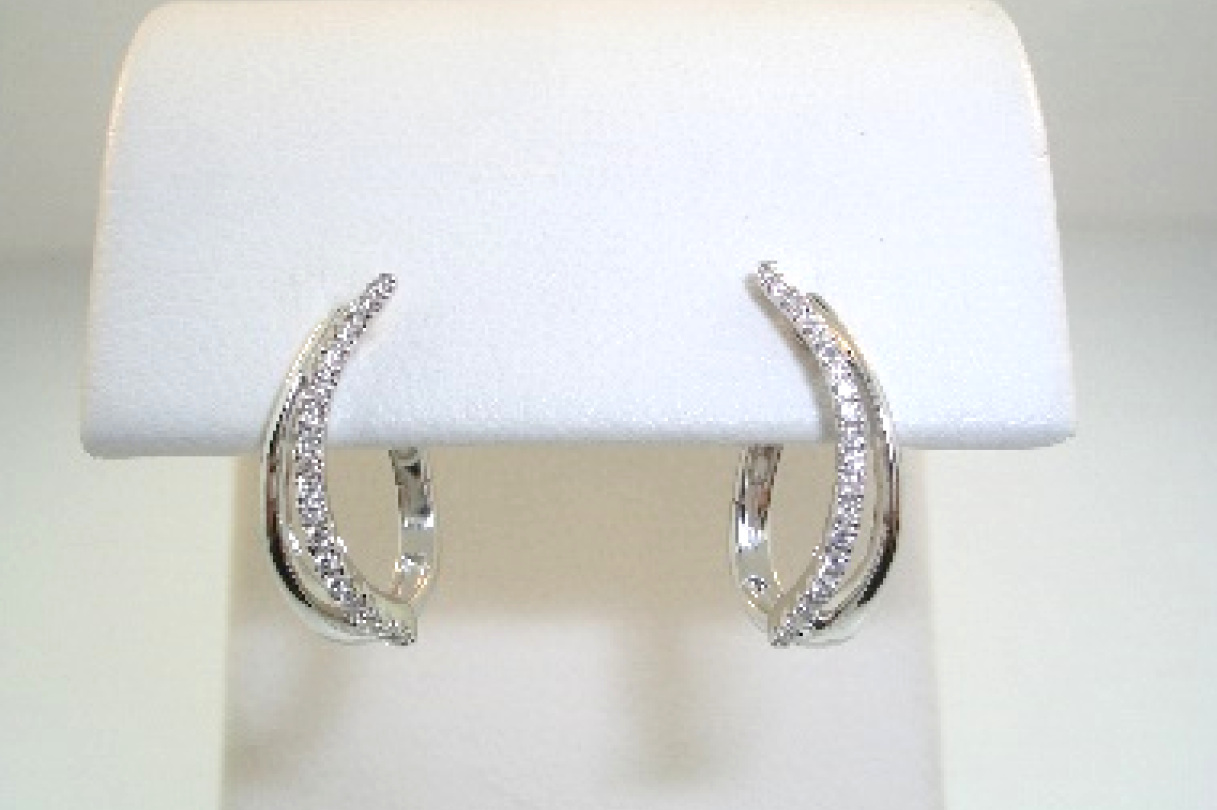 Ladies 14k white gold and diamond double hoop earrings. The earrings are set with one row of diamonds on each earring. Set with (36) thirty-six round brilliant cut I/I1 diamonds with a total weight of .10ct..
