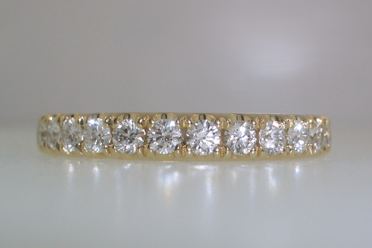 Ladies 14k yellow gold wedding band set with (13) thirteen round brilliant cut diamonds that weigh a total of .53 carats. Gold weight with diamonds is 3.00 grams. Matches diamond card #8871.