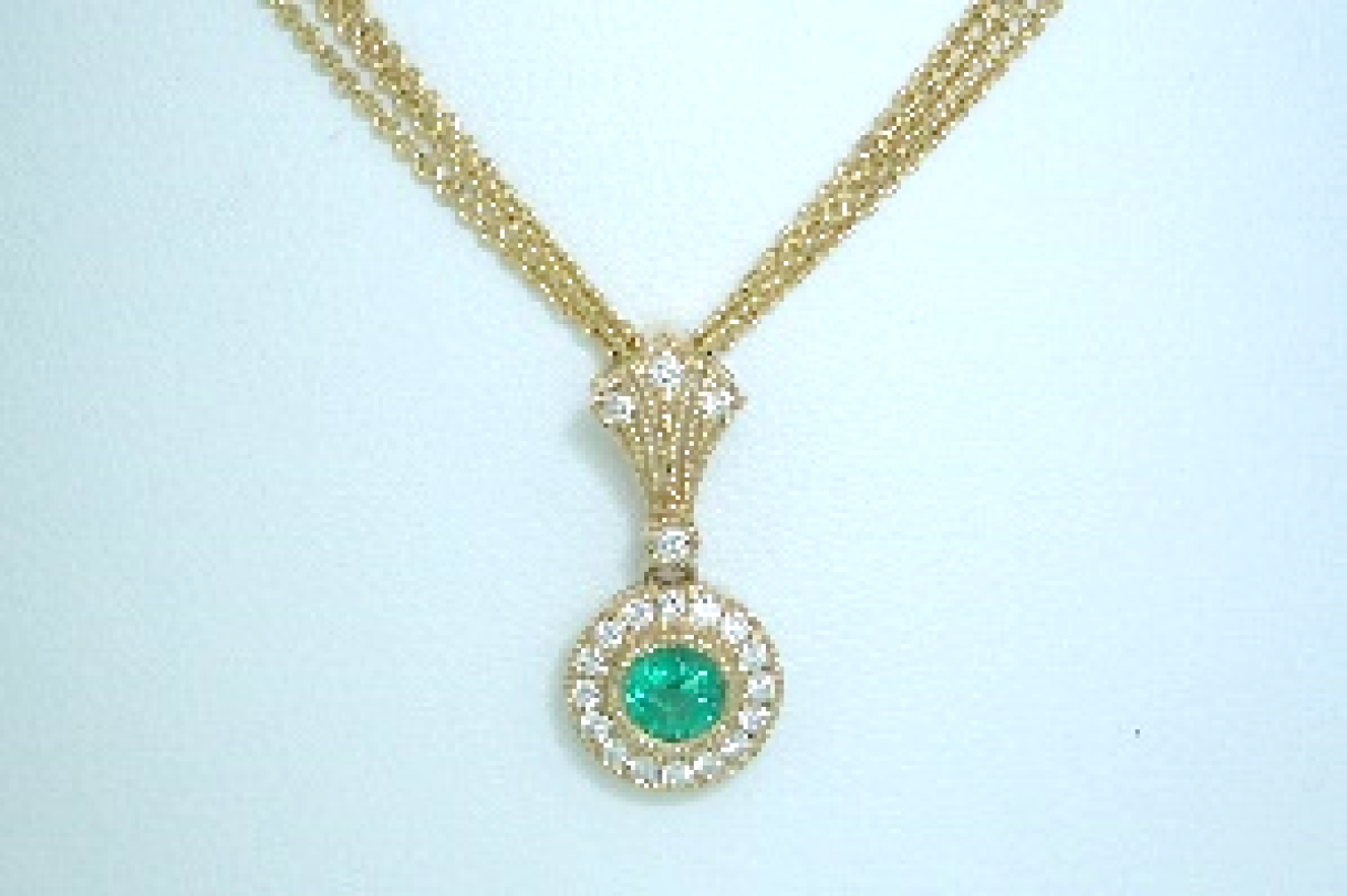 Ladies 14k yellow gold vintage inspired pendant, set with one round faceted emerald gemstone weighing .23ct. and .14ct. diamonds. Complete with a triple cable strand necklace measuring 19 inches in length.