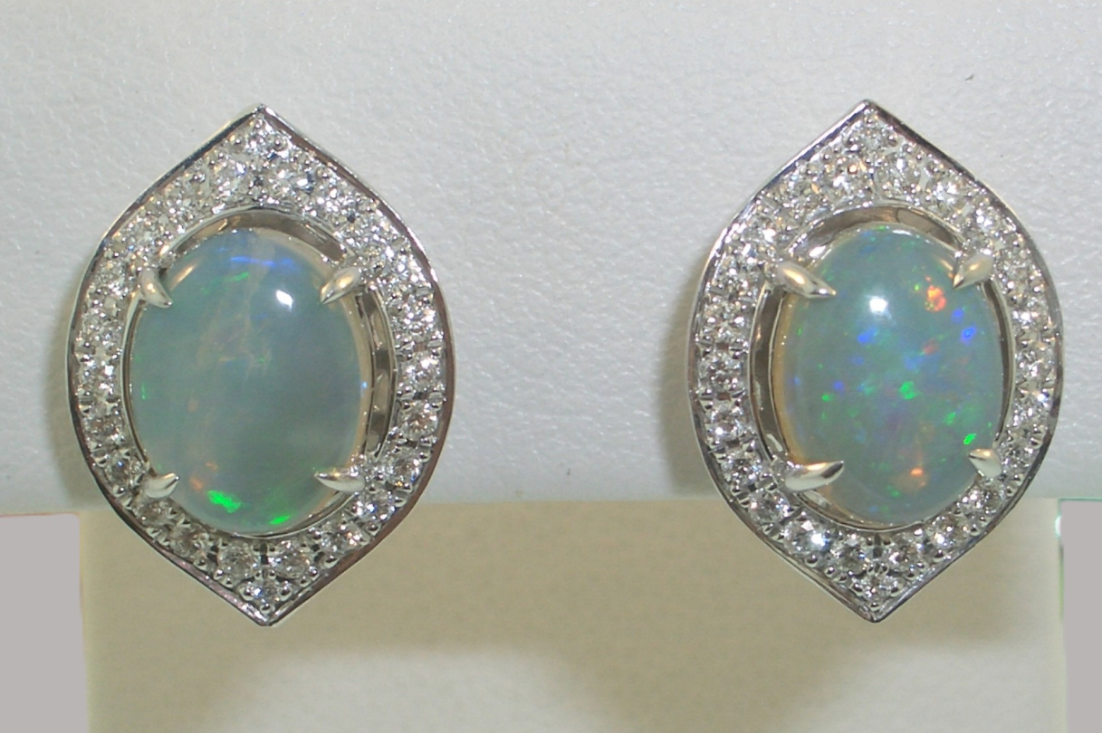 One pair of ladies 14k white gold stud style earrings set with (2) two Australian white opals that weigh a total of 2.39 carats and (48) forty-eight round brilliant cut diamonds that weigh a total of .39 carats