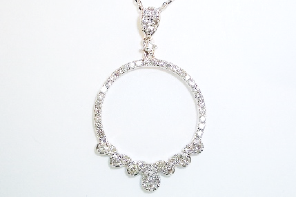 Ladies 14k white gold fancy circle pendant set with (50) fifty round brilliant cut diamonds that weigh a total of .47 carats. Complete with a 14k white gold .95mm dc cable chain that measures 18inches in length.