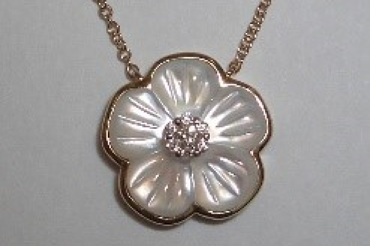 Ladies 14k yellow gold flower motif pendant with mother of pearl inlay and one .06ct. round brilliant cut diamond. Complete with a 14k yellow gold cable chain with 18, 17, 16 inch adjustment.