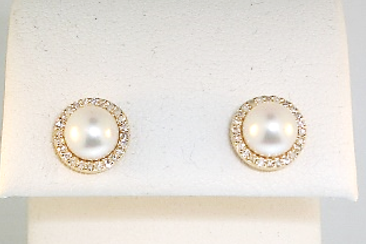 Ladies 14k yellow gold pearl and diamond stud earrings set with (2) two 7mm freshwater pearls weighing. Also set with (48) forty-eight round brilliant cut diamonds that weigh a total of .16ct..