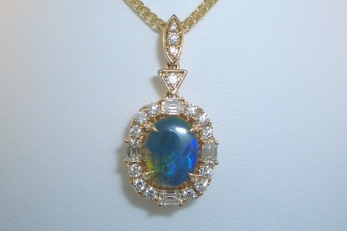 18k yellow gold pendant set with one oval shaped black opal gemstone weighing 1.12 carats. The pendant is also set with (4) four emerald cut diamonds and (16) sixteen round brilliant cut diamonds weighing a total of .80ct.. The piece is complete with an 18k yellow gold polished solid Franco chain measuring 18 inches in length.