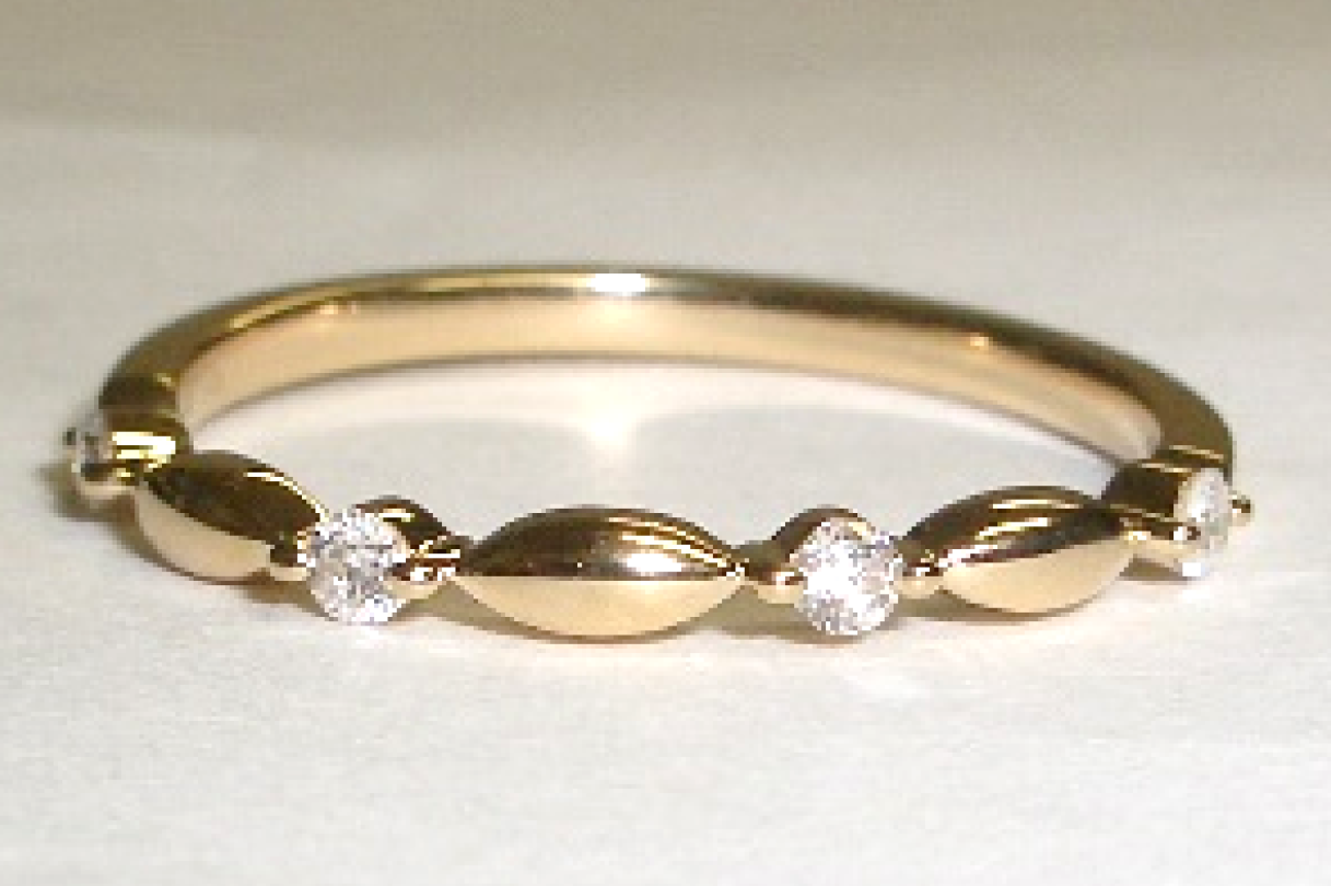 Ladies 14k yellow gold and diamond wedding band, set with (4) four round brilliant cut diamonds that weigh a total of .10ct.. Gold weight with diamonds is 1.57 grams.