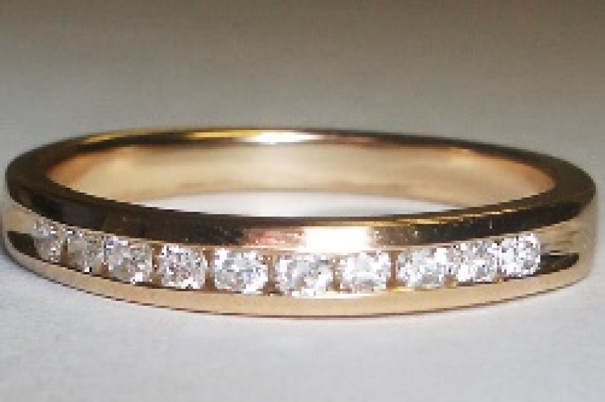 Ladies 14k yellow gold anniversary style wedding band, channel set with (10) ten round brilliant cut diamonds weighing a total of .20ct.. Gold weight with diamonds is 2.97 grams.