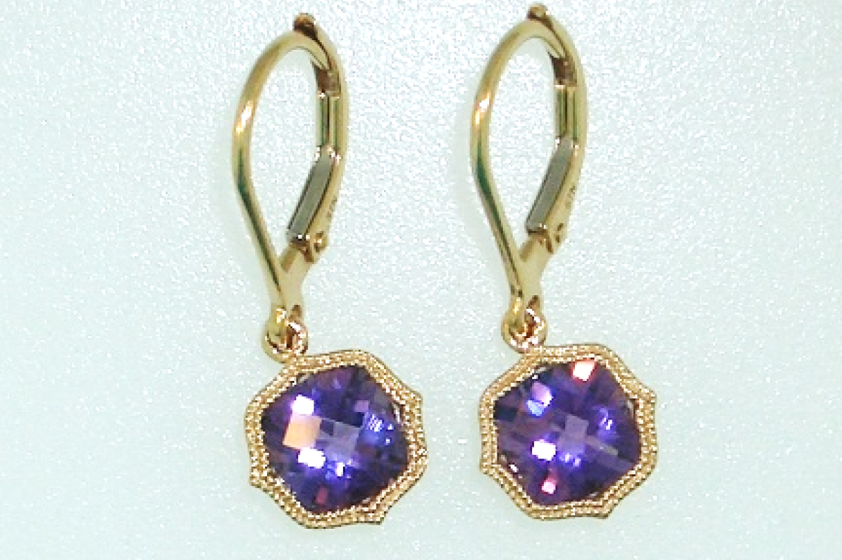Ladies 14k yellow gold lever back earrings with milgrain detailing set with (2) two amethysts weighing 1.67 carats.