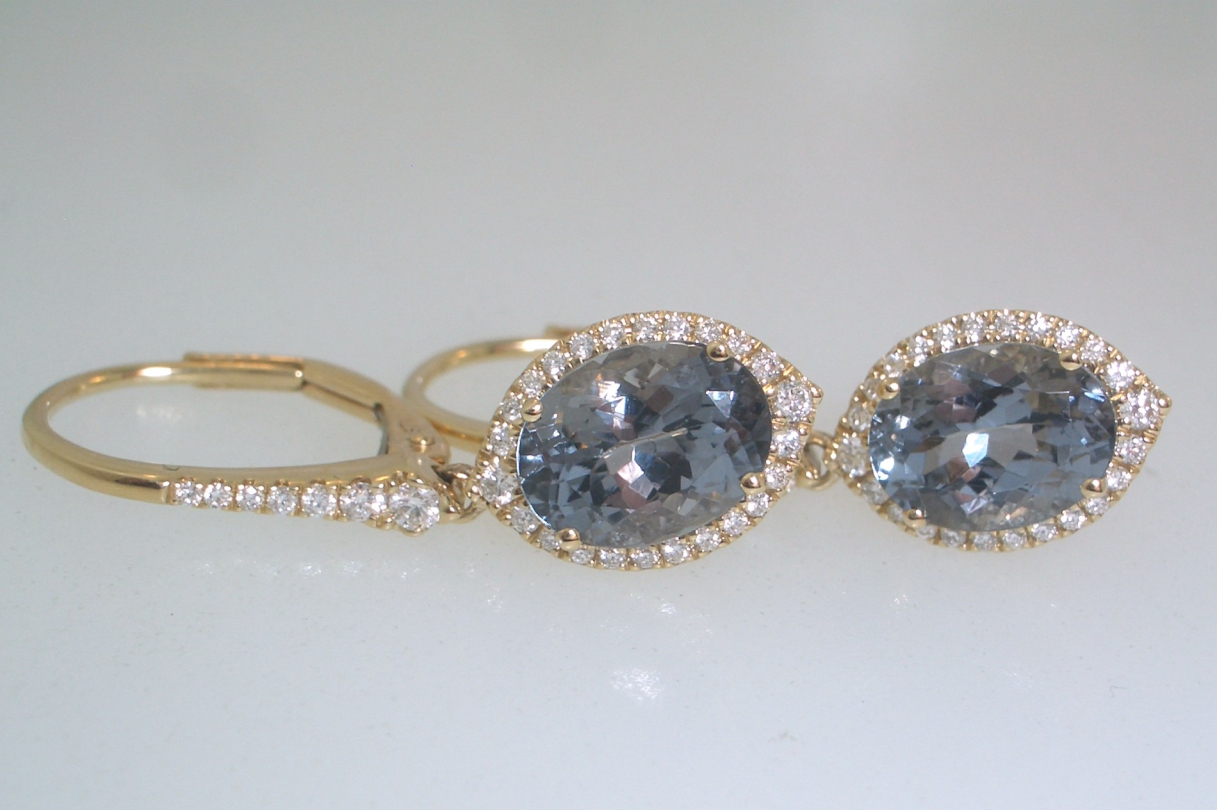 Ladies 14k yellow gold lever back style earrings set with (2) two oval cut grey spinel gemstones with checkerboard faceting that weigh a total of 3.32 carats and (62) sixty-two round brilliant cut diamonds that weigh a total of .29 carats. Gold weight with gemstones is 3.70 grams.