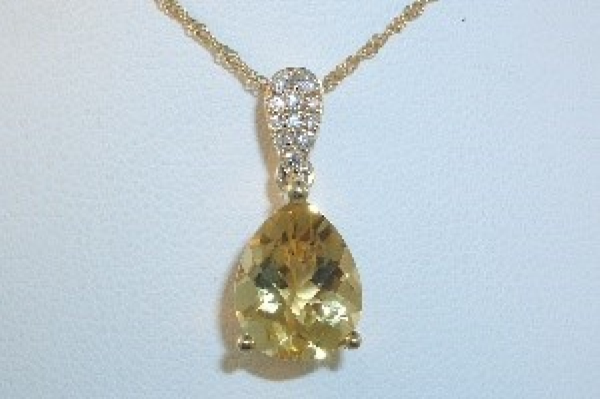 Ladies 14k yellow gold pendant set with one pear shaped with checkerboard cut top light citrine gemstone weighing 2.05 carats, also set with .09cttw diamonds. Complete with a 14k yellow gold 18 inch Singapore sparkle chain.