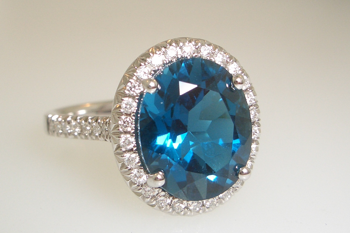Ladies 14k white gold fashion ring, set with one oval brilliant cut London Blue Topaz gemstone weighing 4.63 carats and (42) forty-two round brilliant cut diamonds weighing a total of .25ct..