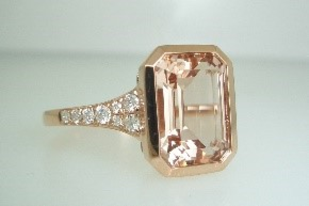 Ladies 14k rose gold fashion ring bezel set with one Morganite gemstone, emerald cut, 10 x 7mm. weighing 2.35 carats/ and (16) sixteen round brilliant cut diamonds weighing a total of .21ct..