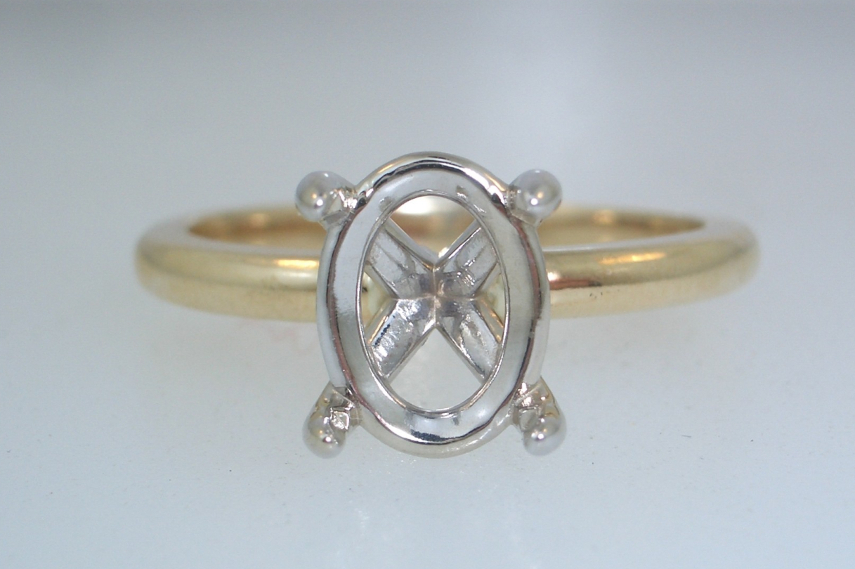 Ladies 14k yellow gold solitaire mounting with a 14k white gold head. Center holds a 9x7mm oval. Gold weight is 3.58 grams.