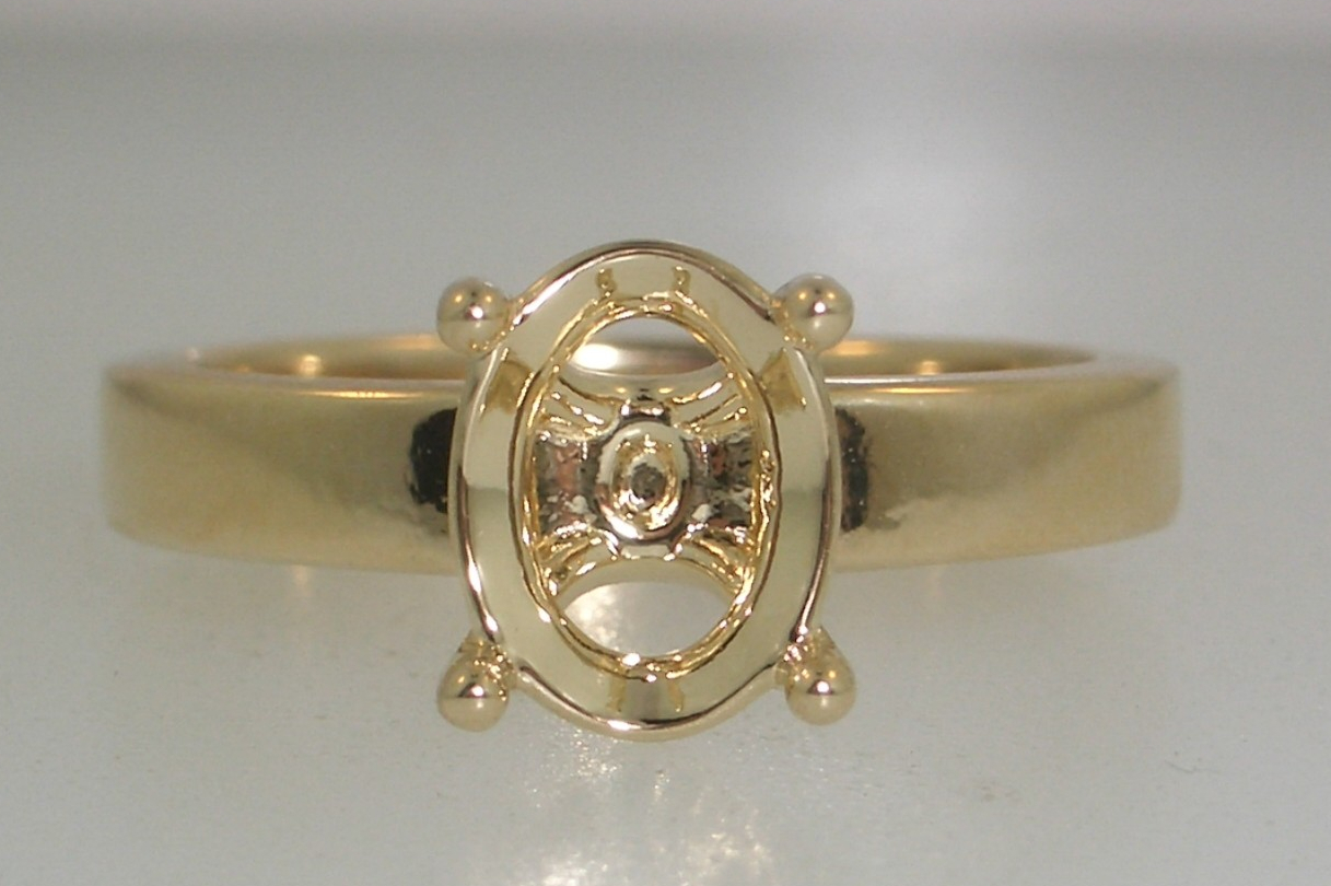 Ladies 14k yellow gold solitaire style engagement ring mounting with a 3.5mm wide band. Center holds a 9 x 7mm oval. Gold weight is 4.28 grams.