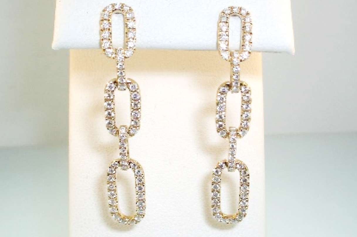 Ladies 14k yellow gold and diamond paperclip style drop earrings set with (119) one hundred and nineteen round brilliant cut diamonds with a SI clarity grade and a I color grade weighing 1.19 carats.