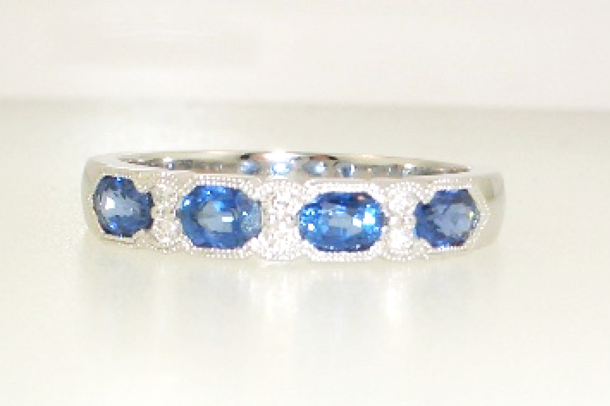 Ladies 14k white gold sapphire and diamond ring with milgrain detailing set with (4) four 4x3 oval pastel blue sapphires weighing .96 carats and (6) six round brilliant cut diamonds weighing .08 carats.