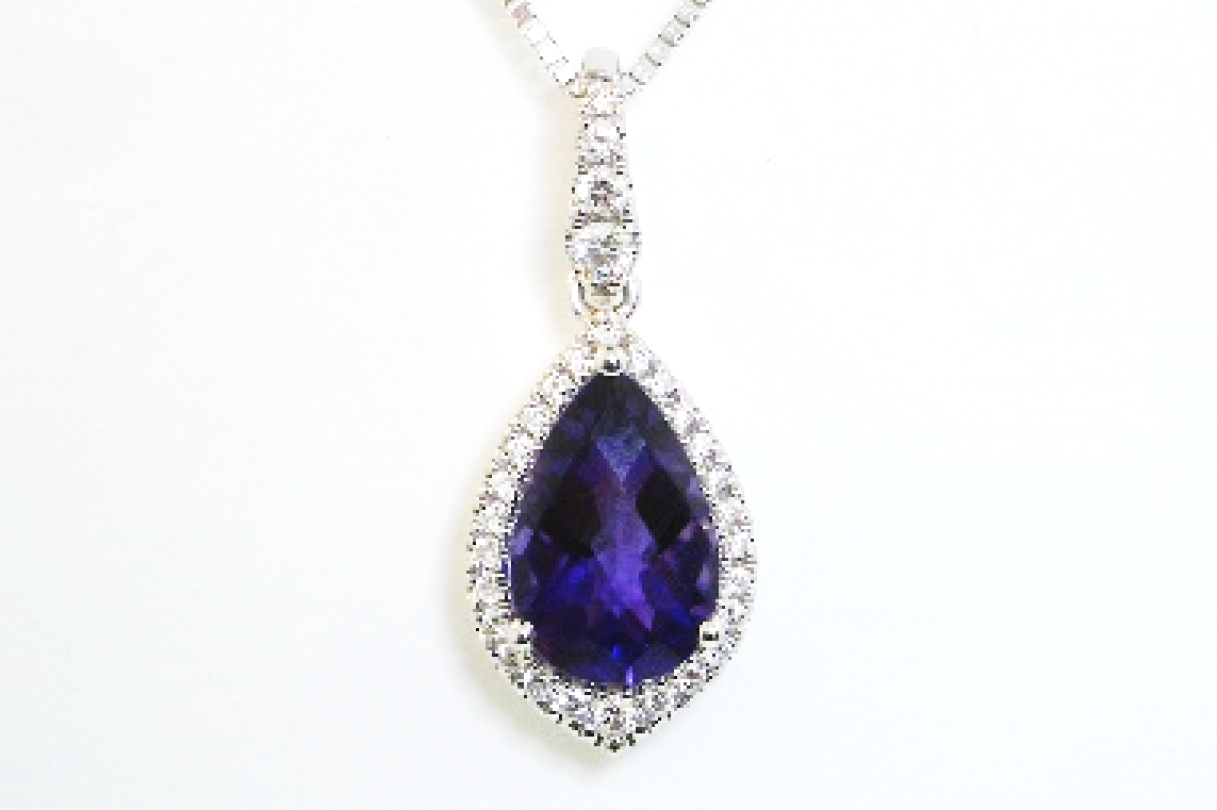Ladies 14k white gold halo style pendant set with (1) one 9x6mm pear shaped amethyst gemstone and (30) thirty round brilliant cut diamonds that weigh a total of .20 carats. Complete with a 14k white gold .7mm box chain that measures 18” in length.