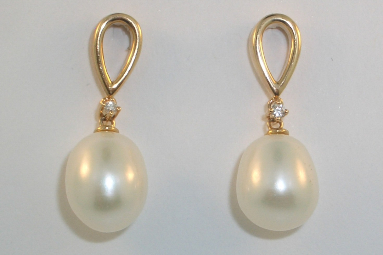 Ladies 14k yellow gold drop style earrings set with (2) 8-9mm fresh water pearls and (2) two full cut round diamonds that weigh a total of .03 carats. Gold weight with gemstones is 3.19 grams.