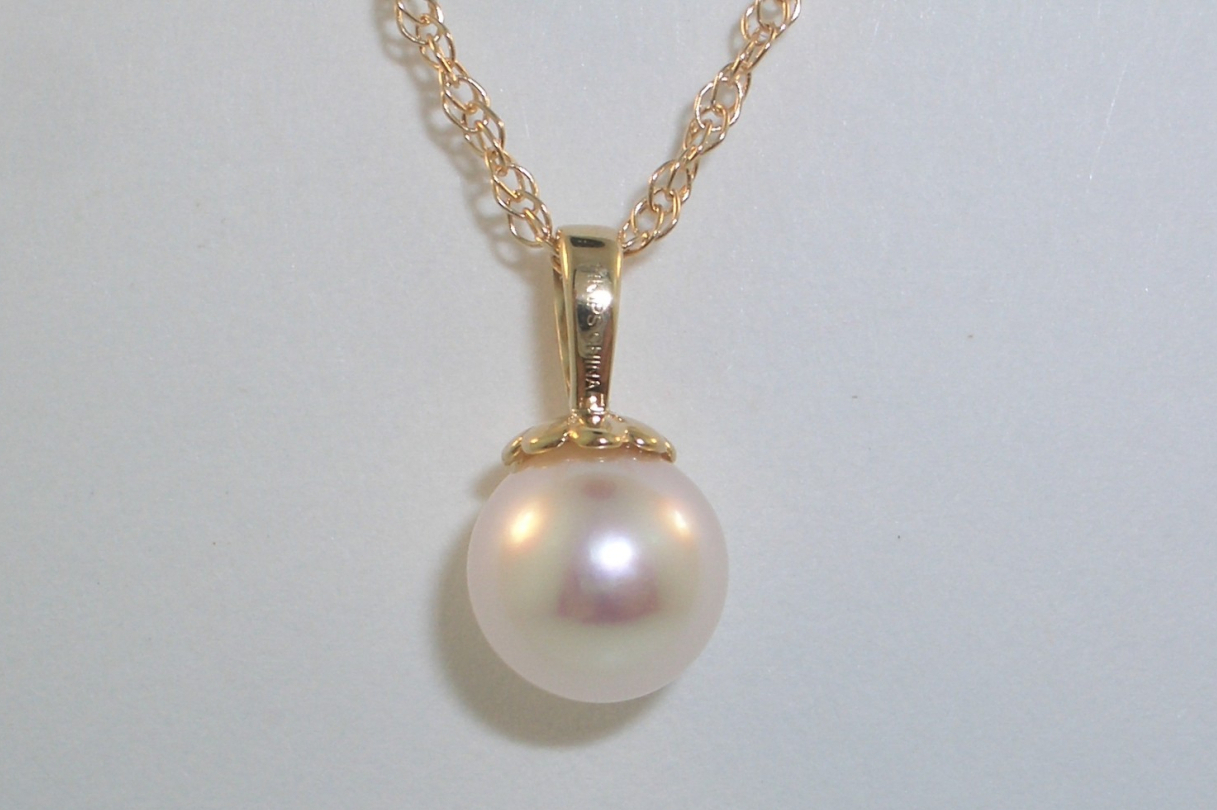 Ladies 14k yellow gold pendant set with (1) one 6mm “AA” quality Akoya pearl with white body color and moderate pink overtones. Complete with a 14k yellow gold light rope style chain that measures 18 inches. Gold weight with chain and pearl is 1.43 grams.