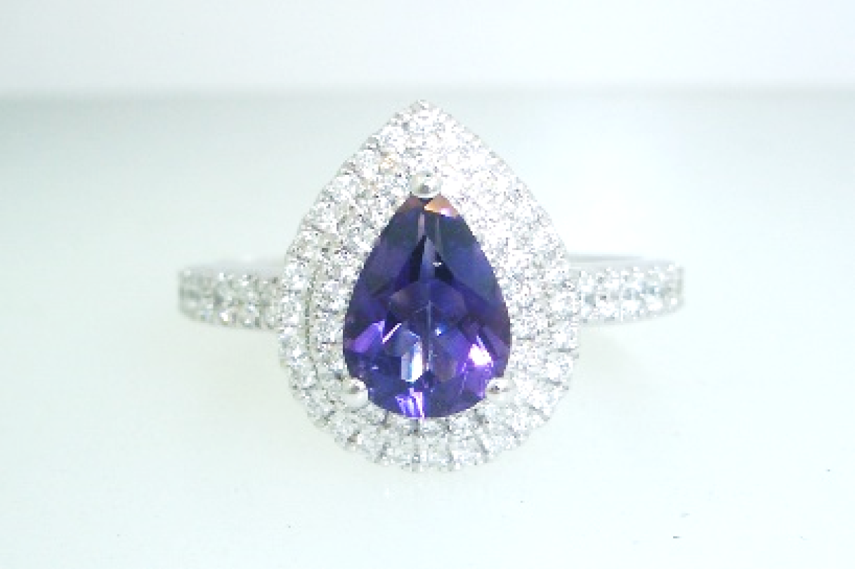 Ladies 14k white gold double halo fashion ring set with (1) one pear shape amethyst and (62) sixty-two round brilliant cut diamonds that weigh a total of .38 carats.