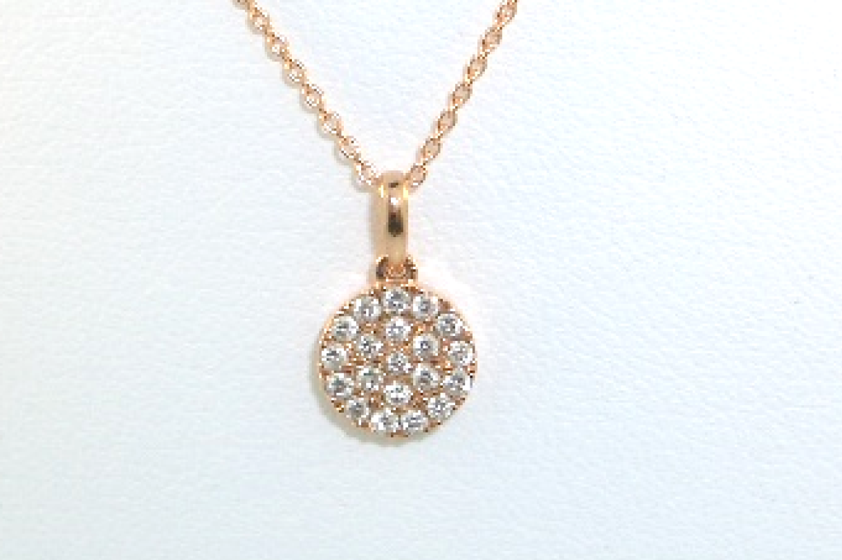 Ladies 14k rose gold disk pave pendant, set with (20) twenty round brilliant cut diamonds that weigh a total of .13ct. completed with a 14k rose gold 18” cable chain. Gold weight with diamonds and chain is 1.86 grams.