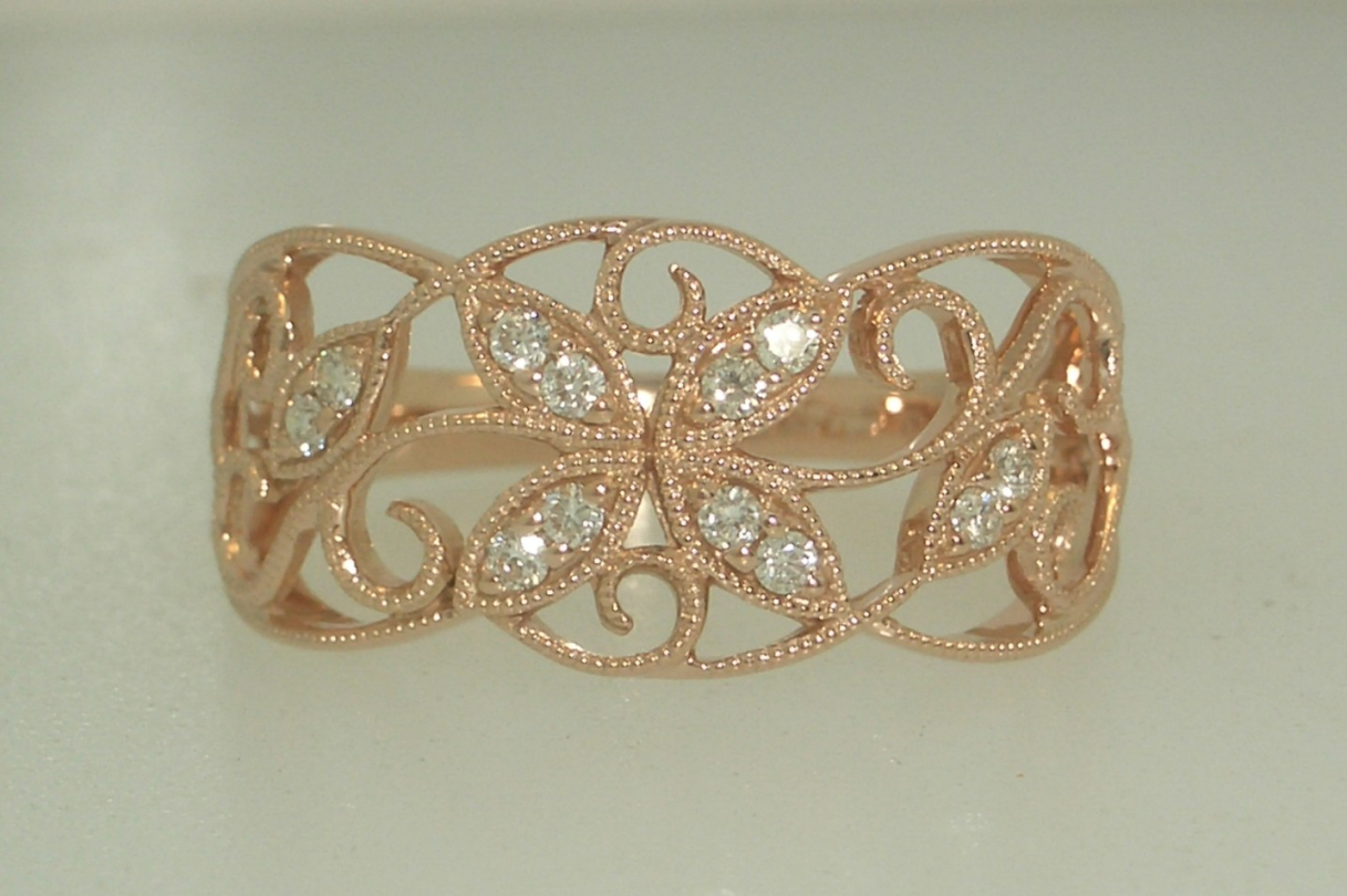 Ladies 14k rose gold filigree ring set with (12) twelve round brilliant cut diamonds that weigh a total of .12 carats.