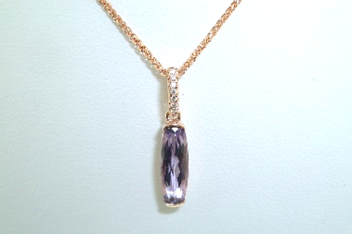Ladies 14k rose gold pendant set with (1) one 12x4 cushion cut lavender amethyst weighing 1.40 carats and (8) eight round brilliant cut diamonds weighing .03 carats. Complete with a 14k rose gold diamond cut wheat chain measuring 18 inches in length.