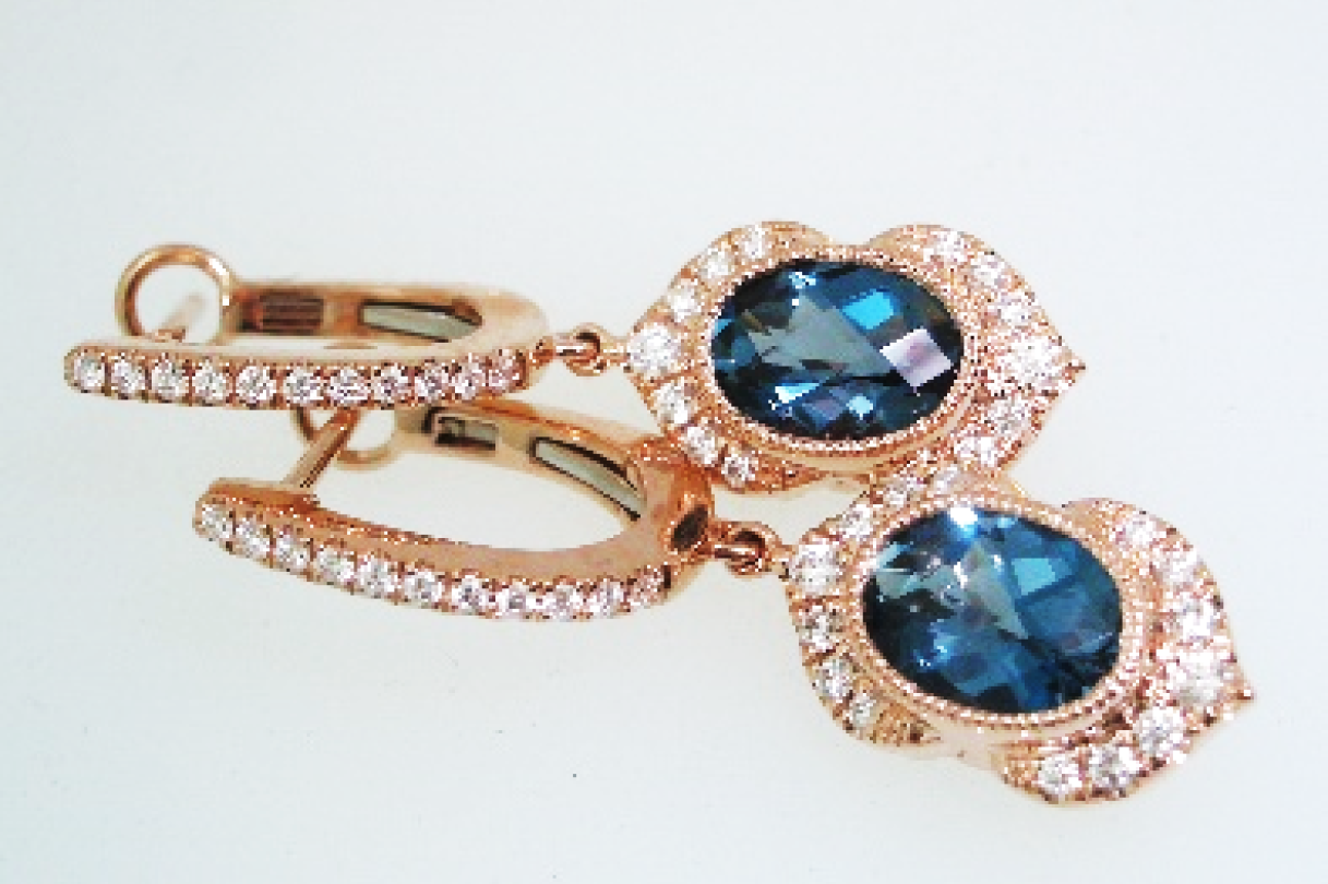 Ladies 14k rose gold drop style earrings set with (2) two oval cut 7x5mm London blue topaz and (50) fifty round brilliant cut diamonds that weigh a total of .32 carats.