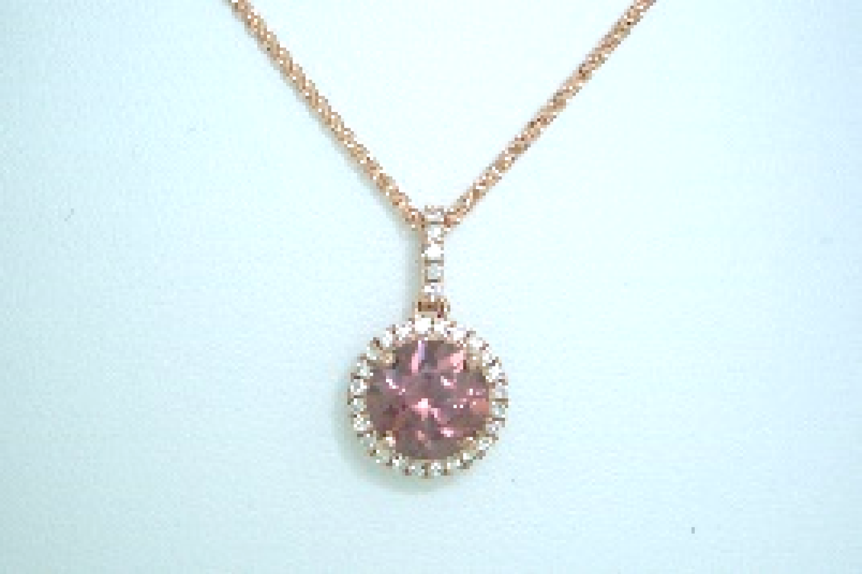 Ladies 14k rose gold pendant with halo design, set with one round faceted spice zircon gemstone measuring 6.7mm. and weighing 1.61 carats. Also set with (29) twenty-nine round brilliant cut diamonds weighing a total of .12ct.. Complete with a 14k rose gold 1mm. diamond cut wheat chain measuring 18 inches long.