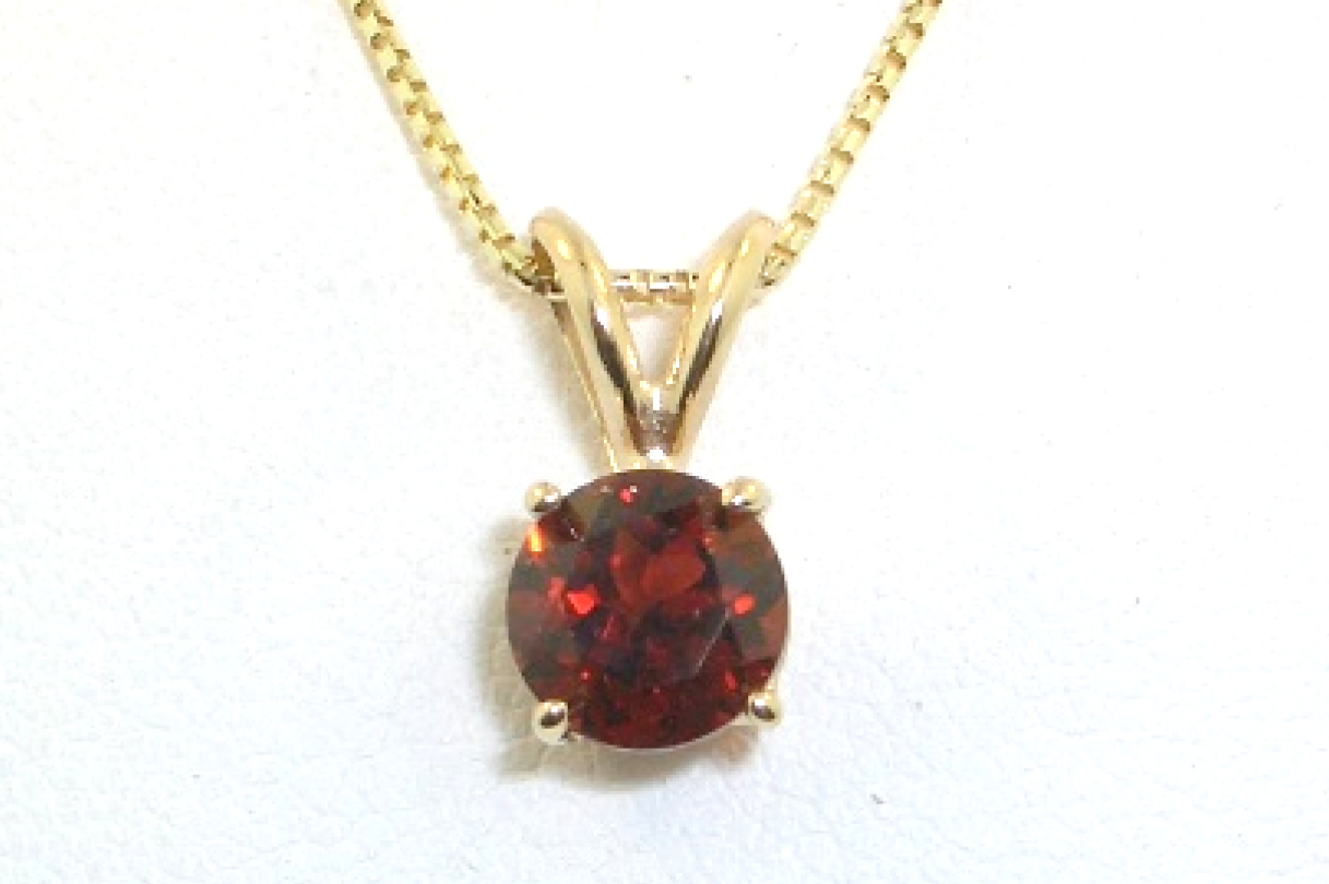 Ladies 10k yellow gold pendant set with (1) one round 6mm garnet and complete with a 14k yellow gold .75mm diamond cut box chain that measures 18 inches in length.