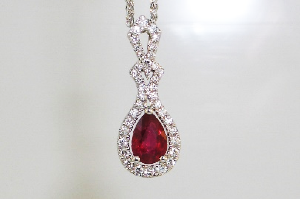 Ladies 14k white gold necklace set with (1) one 6mm x 4mm pear shaped Ruby that weigh .38 carats and (37) thirty-seven round brilliant cut diamonds that weigh .17 carats. Complete with an 18-inch 14k white gold diamond cut box chain.
