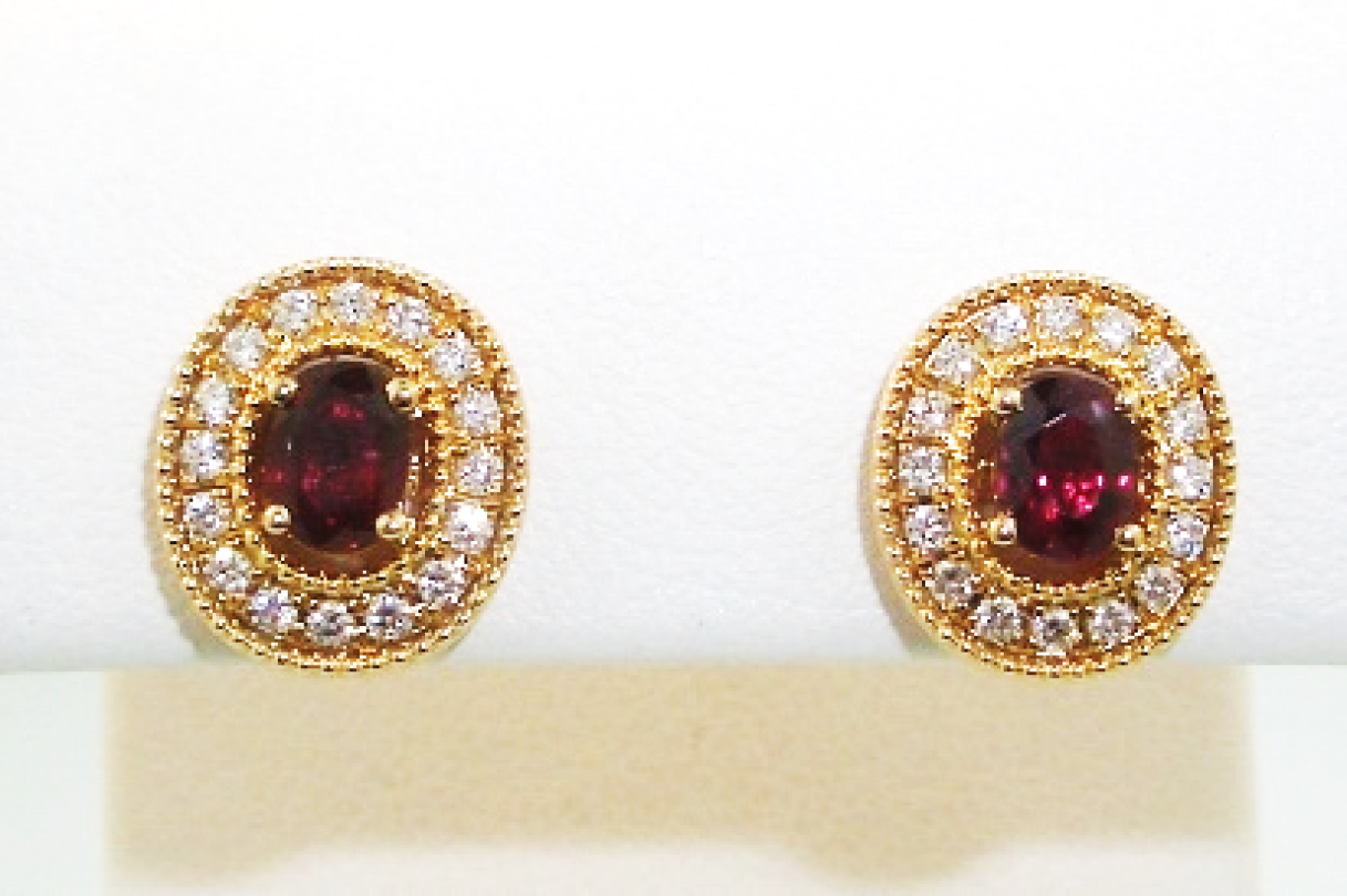 Ladies pair of 14k yellow gold stud style earrings with milgrain detailing set with (2) two oval cut rubies that weigh a total of .77 carats and (32) thirty-two round brilliant cut diamonds that weigh a total of .23 carats.
