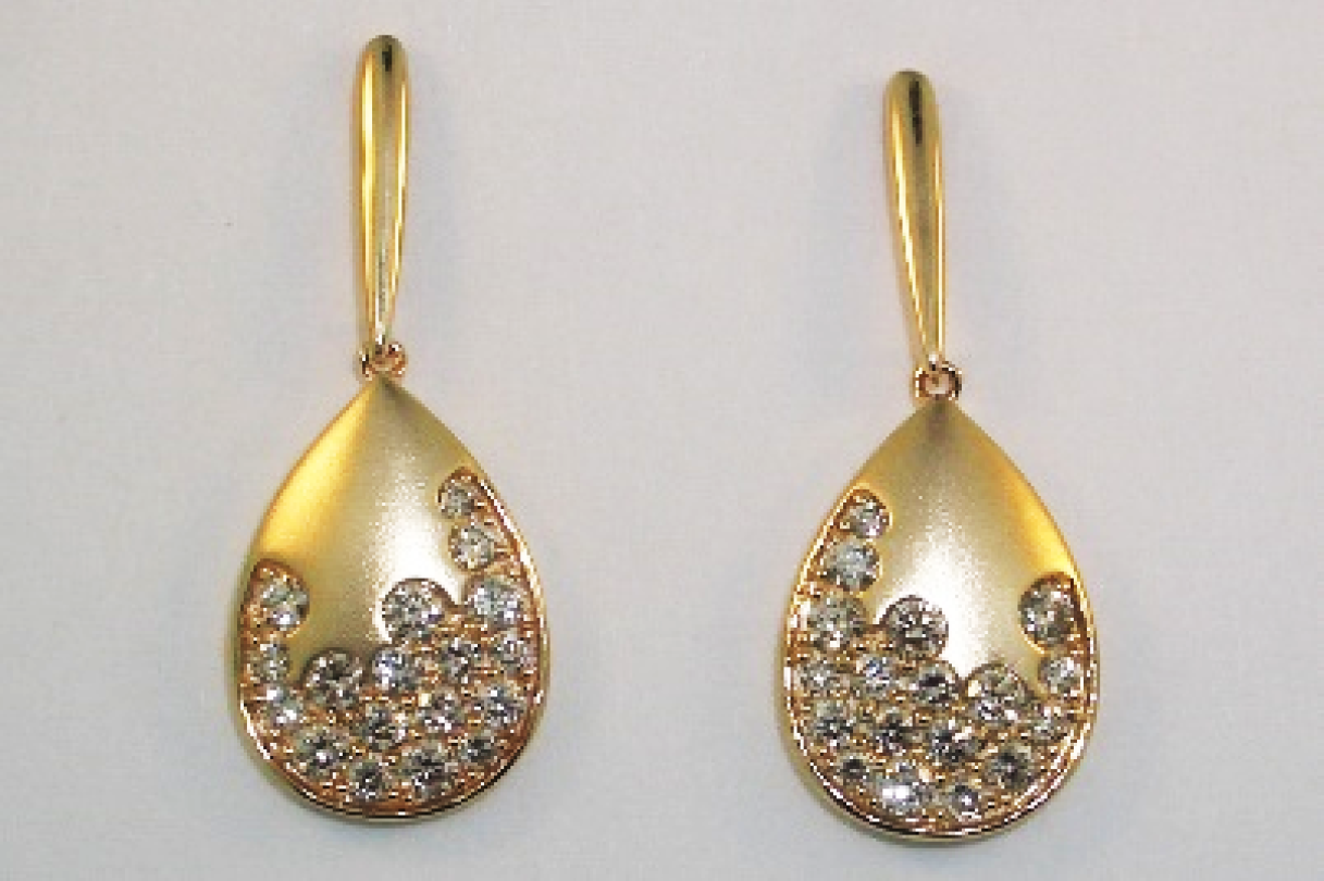 Ladies 14k yellow gold pear shaped drop style earrings with a brushed finish set with (36) thirty-six round brilliant cut diamonds that weigh a total of 1 carat.