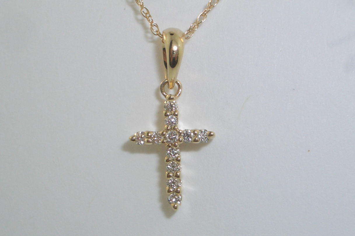 Ladies 14k yellow gold petite cross pendant set wit (11) eleven round brilliant cut diamonds that weigh a total of .09 carats. Complete with a light rope style chain that measures 18” in length. Gold weight with chain and diamonds is 1.18 grams.